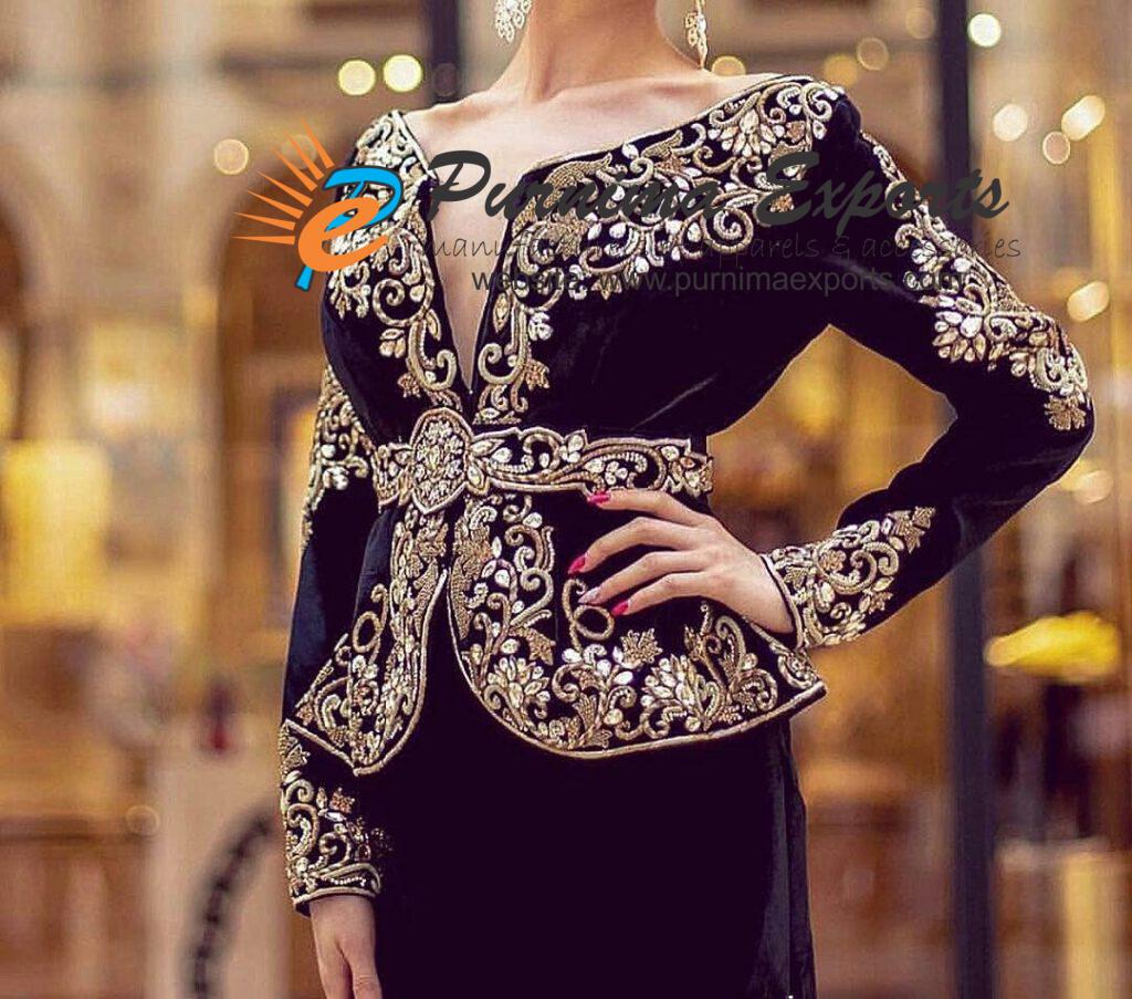 Karakou is a woman’s embroidered jacket that originate from the city of Algiers (Algeria), usually worn with “sarouel Mdouer” or “sarouel Echelqa” -traditional feminine trousers- or in modern days, with long skirt. We at Purnima Exports have been manufacturing hand embellished Jackets on Algerian theme. We have undertaken orders from clients in France, Italy, Morocco for Karakou Jackets and skirts. We undertake individual as well as bulk orders from clients.